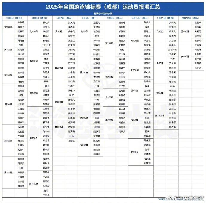 #汪顺全锦赛报名100蛙100自# 2025年全国游泳锦标赛,孙杨、汪顺、潘展乐、张雨霏等名将都将参赛。@汪順Steve 将参加100米蛙泳和100米自由泳,潘展乐将参加50米蝶泳和100米蝶泳。本次比赛是新加坡游泳世锦赛后国内重要游泳赛事,也是十五运资格选拔赛。加油!#汪顺潘展乐等出战游泳全锦赛#